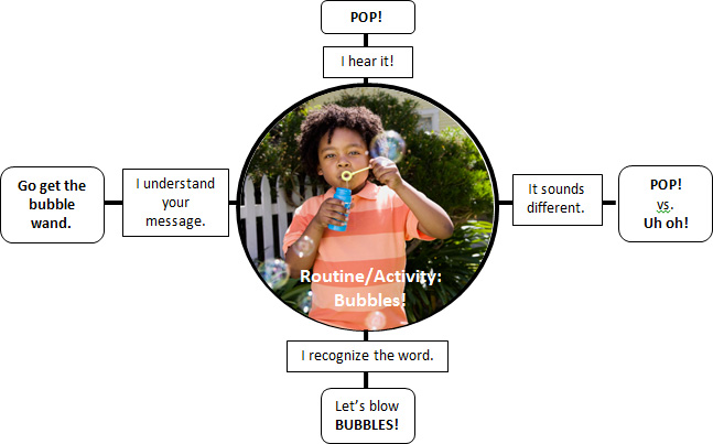 Expand: Expand on your interaction by adding language to your play. Think about what your child might say if he could and add language to your child’s attempts. (Child: More buh buh; Adult: You want more bubbles!)